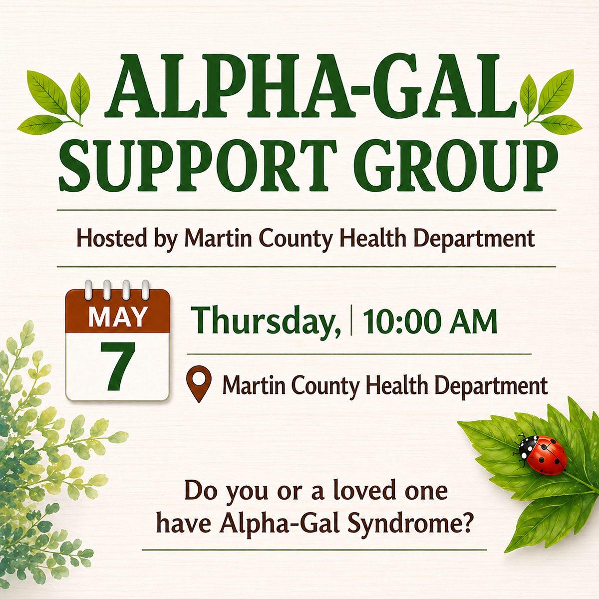 BY DOROTHY DILLON INEZ — The Martin County Health Department will host an Alpha-Gal Support Group on Thursday, May 7, at 10 a.m. at the health department, 136 Rockcastle Road in Inez. The free event is open to people living with Alpha-Gal syndrome, caregivers and anyone who wants to learn more about the condition. The